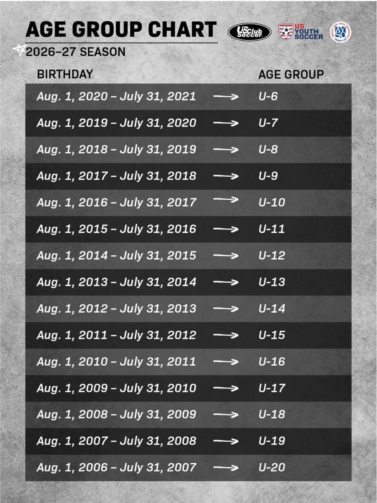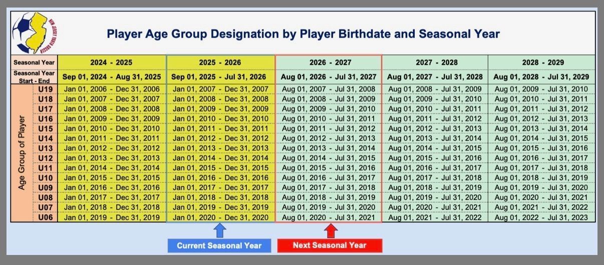 Starting with the 2026-27 season, U.S. Soccer has directed youth soccer organizations to move to a school-year based age group model, using an August 1 - July 31 cutoff